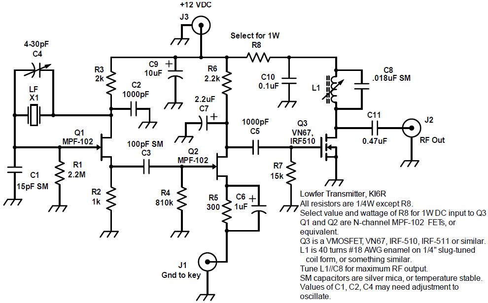 I'm attaching a version of Ed's LowFER transmitter schematic in GIF form. Takes me back to the good 'ol days when you could get custom crystals in almost any frequency range. I agree with what Ed says about experimenting with capacitor values for crystals in this range, especially when using FETs as the active device. One of my better performing oscillators from that time was of the same general design as Ed's, but with C2 as low as 180 pF with some crystals, I tended to use a little larger trimmer (C4), configured across C1 rather than the crystal. our mileage may--and almost certainly will--vary. We'll soon add some of the other transmitter circuits Ed mentioned to the LWCA Libary section. Thanks for making them available, Ed.
