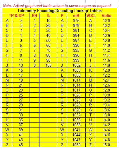 For those who may be interested, I've attached the decode sheet used by my Excel spreadsheet to automatically decode telemetry that I obtain and import from the awesome WSPR Rocks! website. I use ranges of temperature (TP), humidity (RH), dewpoint (DP), barometric pressure (P in millibars, mB) and solar/battery voltage status (VDC).
