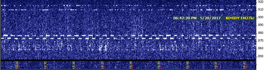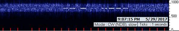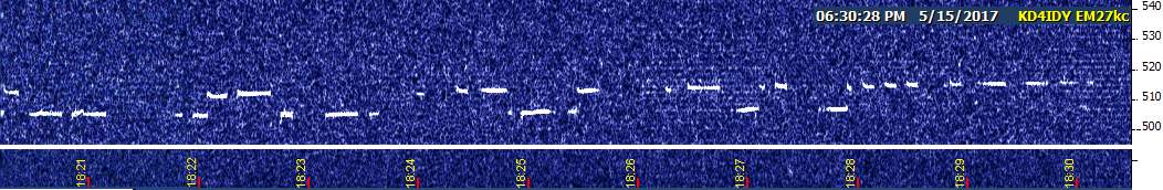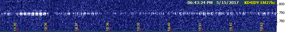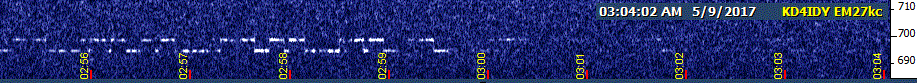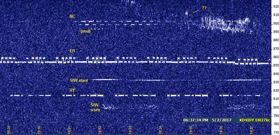 Returning to the watering hole, I had USC, NC, and EH. EH was slowly drifting up into NC's squarewave and fading out. NC was also drifting upward, but slower. Then, right at 4 PM CDT, a signal began appearing that I first thought was EH in noise mode, but over time I realized there were a number of key differences. For one thing, it was much more confined in bandwidth than EH noise mode. For another, it had an appearance that suggested graphical mode. And the biggie: for the next three hours, NC continued to drift, but this mystery signal didn't budge!