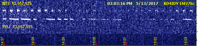 Things were going along pretty ordinarily Sunday afternoon except for a solar flux a little higher than it has been recently, which gave me about 10 minutes of really great PBJ, and what appeared to be MTI but with a different sound than previously. Lots of rapid QSB made it hard to tell why. I could only get an occasional M or T and maybe an I, plus there seemed to be something afterward that I never could quite hear. I thought perhaps it was two MTI's in a row, then a break. The timing is definitely different from before, too.