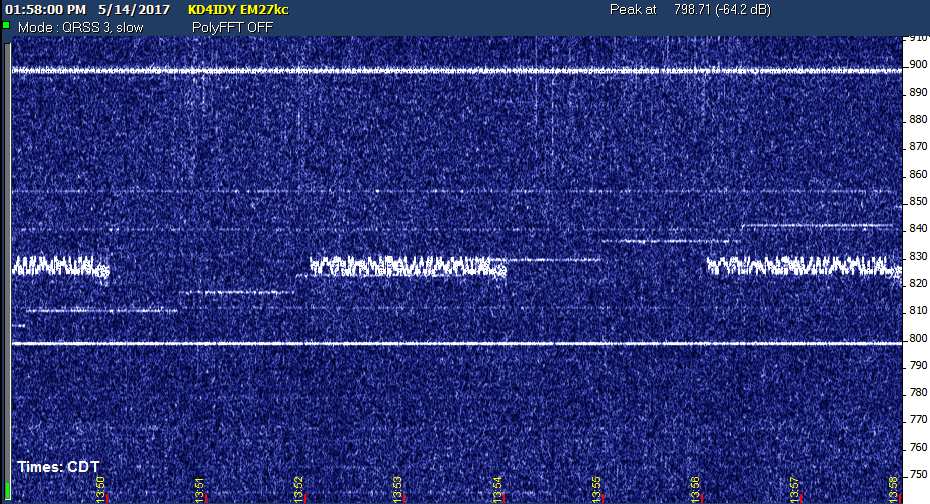After the Friday afternoon report, things settled down to only the usual three at the watering hole for most of the afternoon (EH, NC, USC) plus codar. At 4:58 PM CDT, SIW slant magically appeared with minor traces of the WSPR signal, before disappearing half an hour later. After another half hour, both abruptly returned. WM also re-appeared shortly thereafter, but I don't know exactly when because the capture on that Argo screen accidentally got turned off.