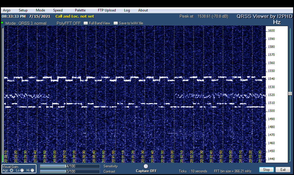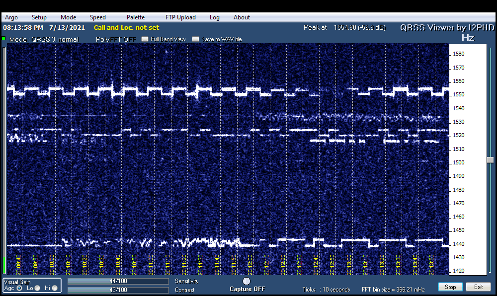 I did see SZX a little more consistently than ROM. For a while during late morning, I even had audible copy of the SZX CW ID for the better part of a minute and a half! That interval is shown in the attached Argo screen shot, which also includes the single best QRSS ID of the day. Elsewhere at the watering hole, only EH and NC were present. About 40 minutes earlier, I had good aural copy of MTI, and a little better visual copy of ROM.