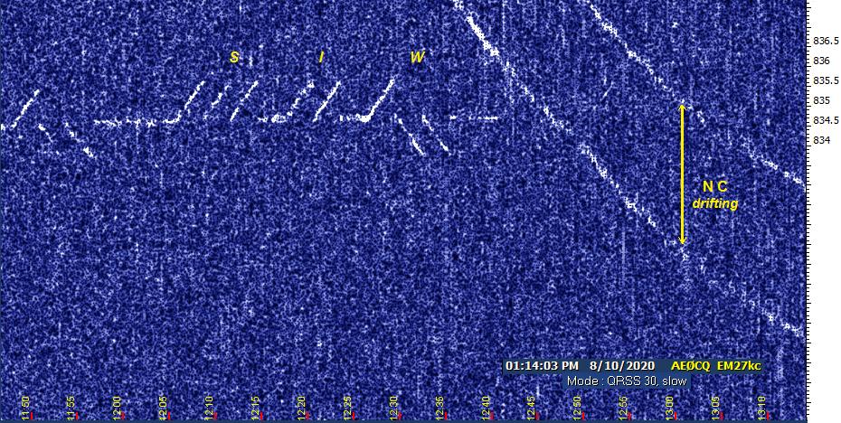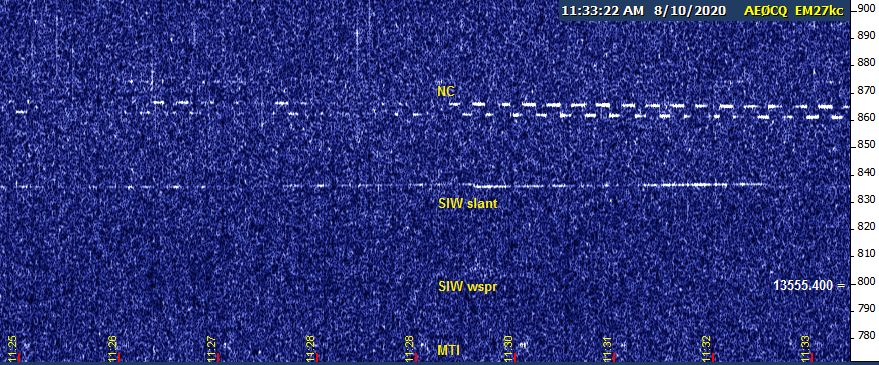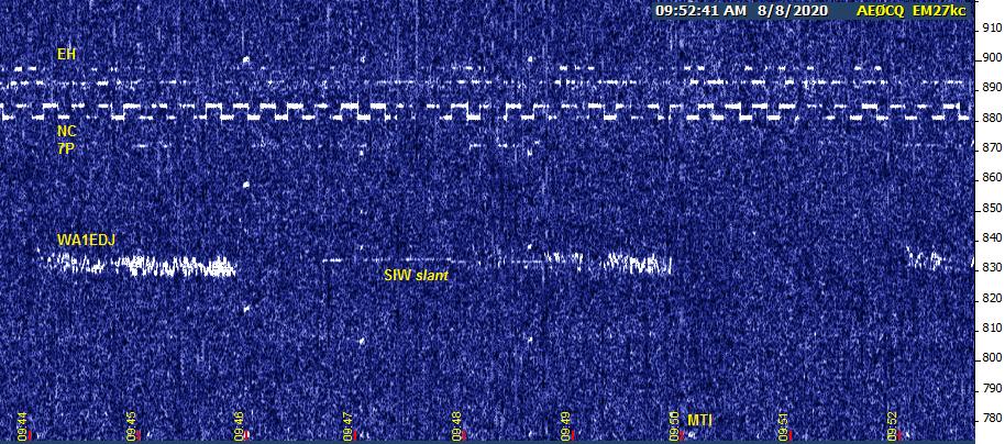 When I returned to the watering hole after 9:33, JB had joined the party. I could now confirm that it was PVC that EH was preparing to walk over. NC was already right on top of 7P. SIW slant was occasionally strong, and K3SIW WSPR began showing up for seconds at a time.