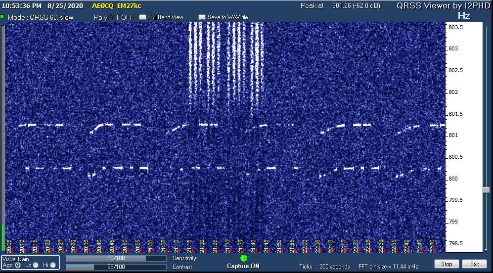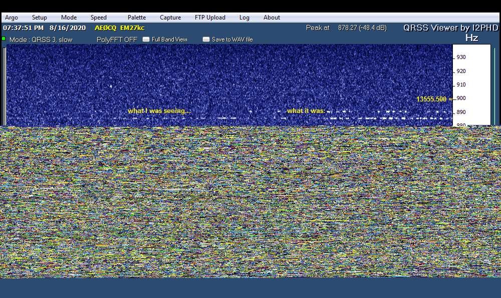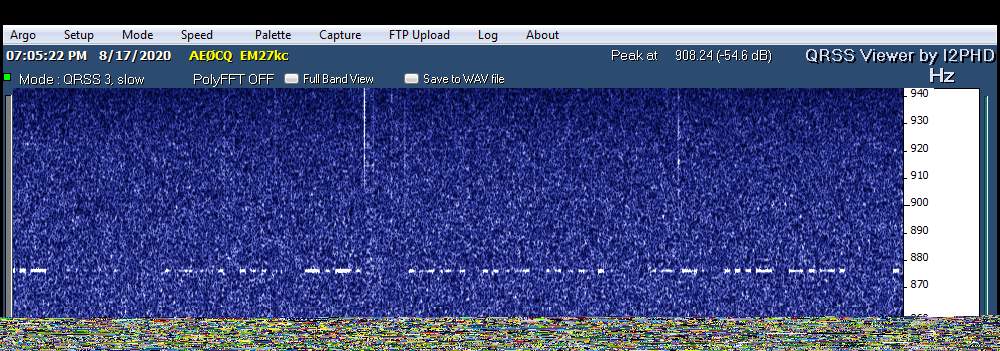 On the other hand, if I had remembered to switch Argo back to QRSS60, the times with full power would have been of such short duration on screen as to be easily overlooked or possibly mistaken for something else.