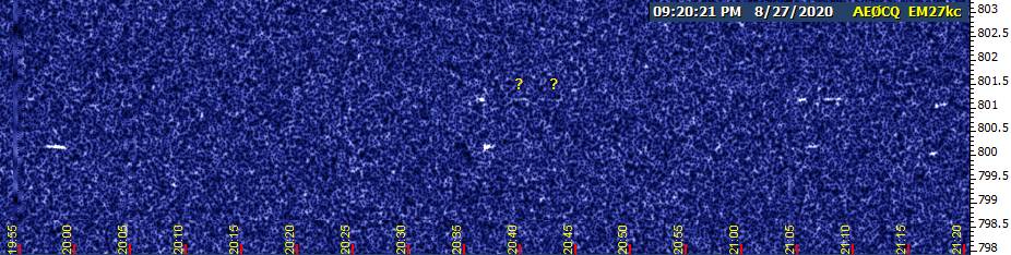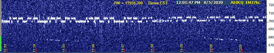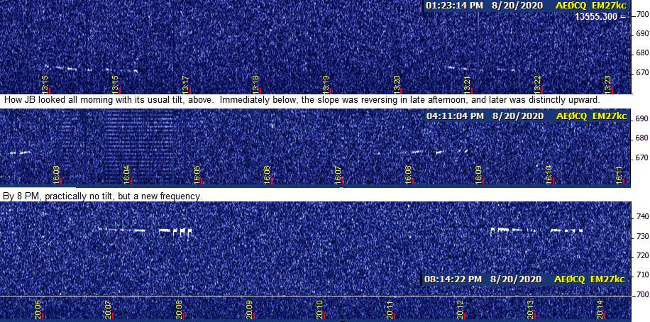 What I'm looking for is further evidence of the abrupt skywave switch-on that seemed to take place Tuesday night. I was tuned to the FSK slot, figuring I'd have the greatest statistical chance of catching my first glimpse of signal there. Nothing at all from 5 o'clock until just after 8:04 PM CDT, then bam, there it was. If I can safely set up in time this evening, I'll try to be at the controls in person and switch between frequencies at the appropriate times to catch both modes around sunset.