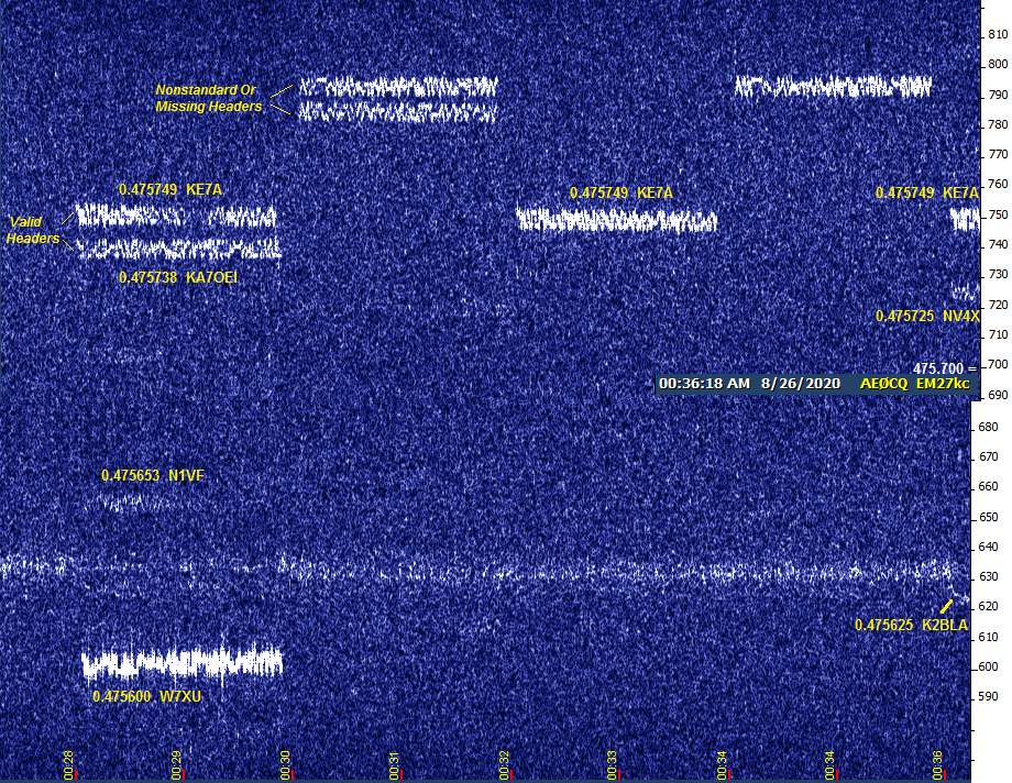 The textual frequency and call labels were copied and passed directly from my ALL_WSPR.TXT file of the decodes for those specific time slots. The non-decoders in question are the one frequent sender at 475,790 and its occasional partner just above 780 Hz. (What really impresses me are successful decodes like N1VF, who was only visible for half the time slot, and K2BLA, who is so close to the permanent noise band.)