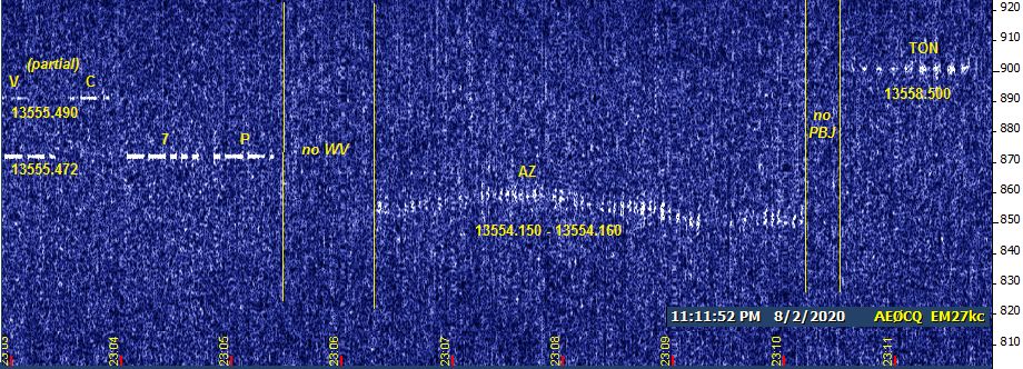 Nice going, Bob. My own Sunday HiFERs were late evening because we were expecting afternoon storms (which ended up not materializing, of course, since I was prepared for them). One attachment is a full nine minute continuous screen of a rapid Tier 1 scan of the lower half of the band, showing broken-up V and C of PVC and a brief plainly audible 7P. Then I checked for WV with no luck. AZ was present, and up to fair audibility at times, but undulating in frequency. No sign of PBJ for a few weeks now. TON was visible and faintly audible.