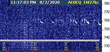 Attached are two files illustrating the kinds of things I've been seeing, and there are two kinds. One is the seeming reduced-bandwidth variant of WSPR that I was griping about last night, but apparently did not save a picture of it. (It wasn't there later in the night with all its 60 Hz sidebands...fortunately.) However, it resembles the signal in image "20auga78.jpg" from 2200 meters last Thursday, apart from the 630 meter version lasting only two minutes at a time, instead of five. I'd go to the field and check again now, except for the threat of pop-up storms for a few more hours.