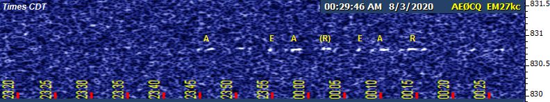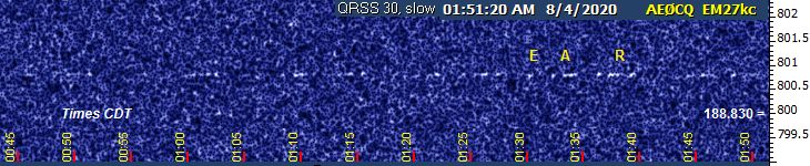 On Saturday morning I had several snippets of RF that were unmistakably EAR by virtue of frequency and repetition rate, but no disinterested party without that prior knowledge would have recognized it. This one I feel comfortable counting. Like last month's, this was a QRSS60 screen stretched ×2 horizontally to emulate the span of QRSS30 with a few more dB sensitivity.