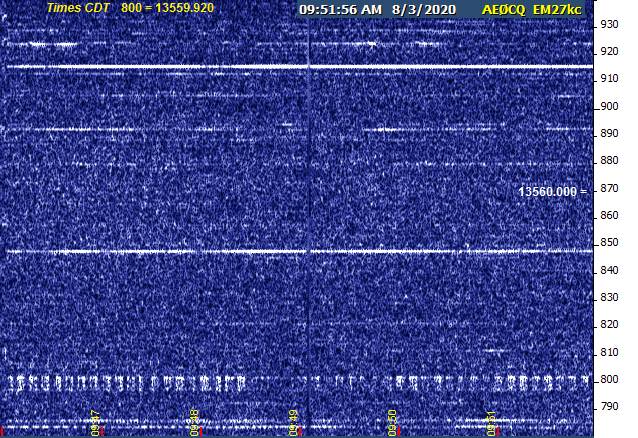 In my first band scan right at the end of the 9 AM hour CDT, I detected keyed RF at 13563.330 that I hoped might be T at long last, but the duration of each sideband cluster was clearly too long. It never reached audibility, and was gone again in a matter of seconds. FRC was faint copy right at 10:02 AM.