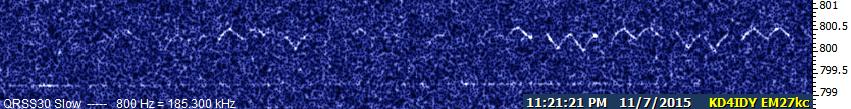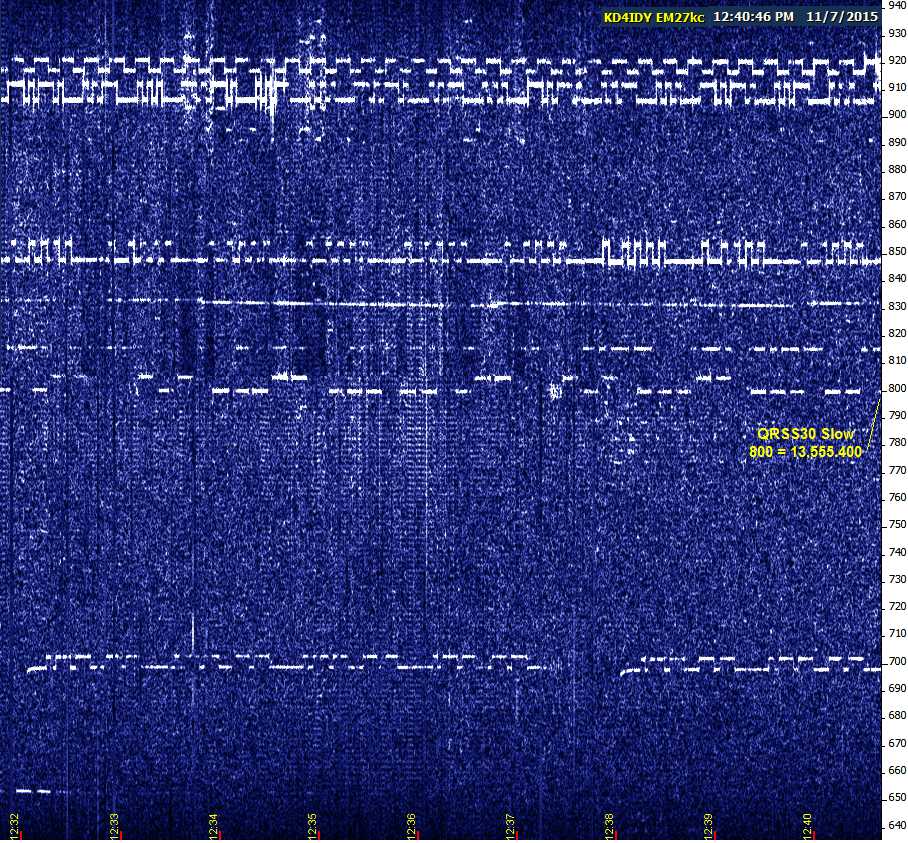 Popped into the shack this morning and tuned to the watering hole. I caught USC from South Carolina coming in very strong, audible at times at 13555.480 QRSS3 and SIW in QRSS30 with a decent signal too. 13555.400. This took place around 1520z 11/23/2015.