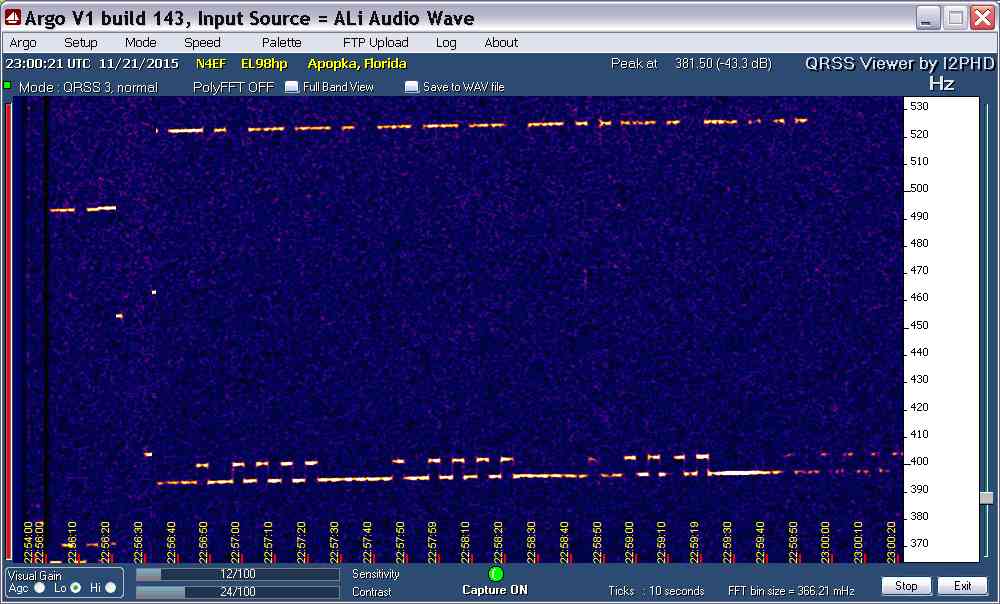 I got a clear capture of V1RGO/B about 120 Hz above EH on Nov 21 at 6:03 pm EST. Both signals fell off sharply 3 minutes later in central Florida. FL moves to wateringhole in DFCW8