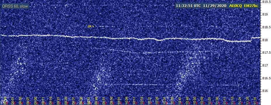 The second half of the night was less successful. JH sorta showed up every so often (mostly dashes from the J and only a few dots) but a powerful unknown source of QRM kept hovering between 181818.0 and .3 throughout the night and into the daylight hours.