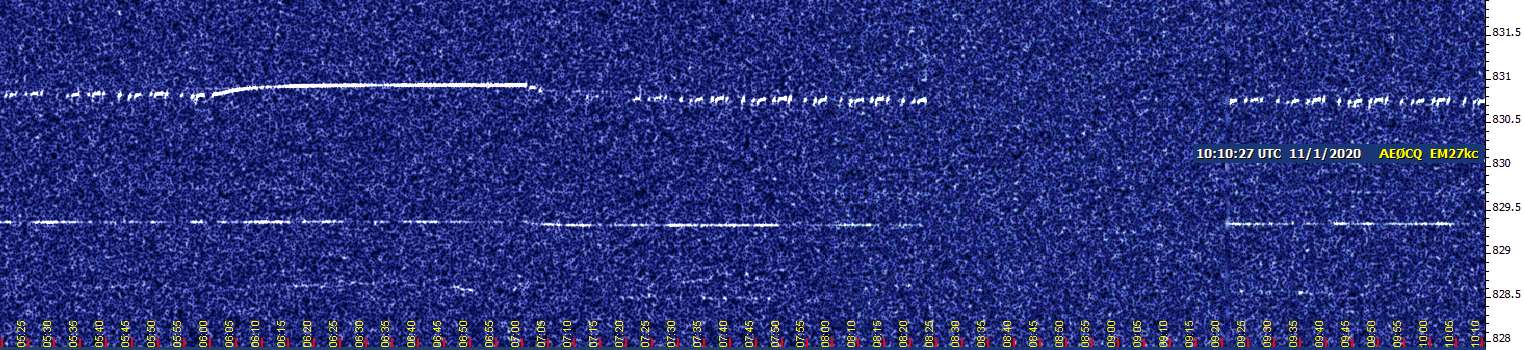 Afterward, there was an interval with little signal here, which might have been an ordinary fade. (I wonder if Andy had a similar result?) Around 0825 UTC, though, while I was not conscious, there was another anomaly for 55 minutes, but this one might be at my end since the PLC signal went away too for the duration. Maybe my receiver took a lunch break; it was a spooky night, after all.